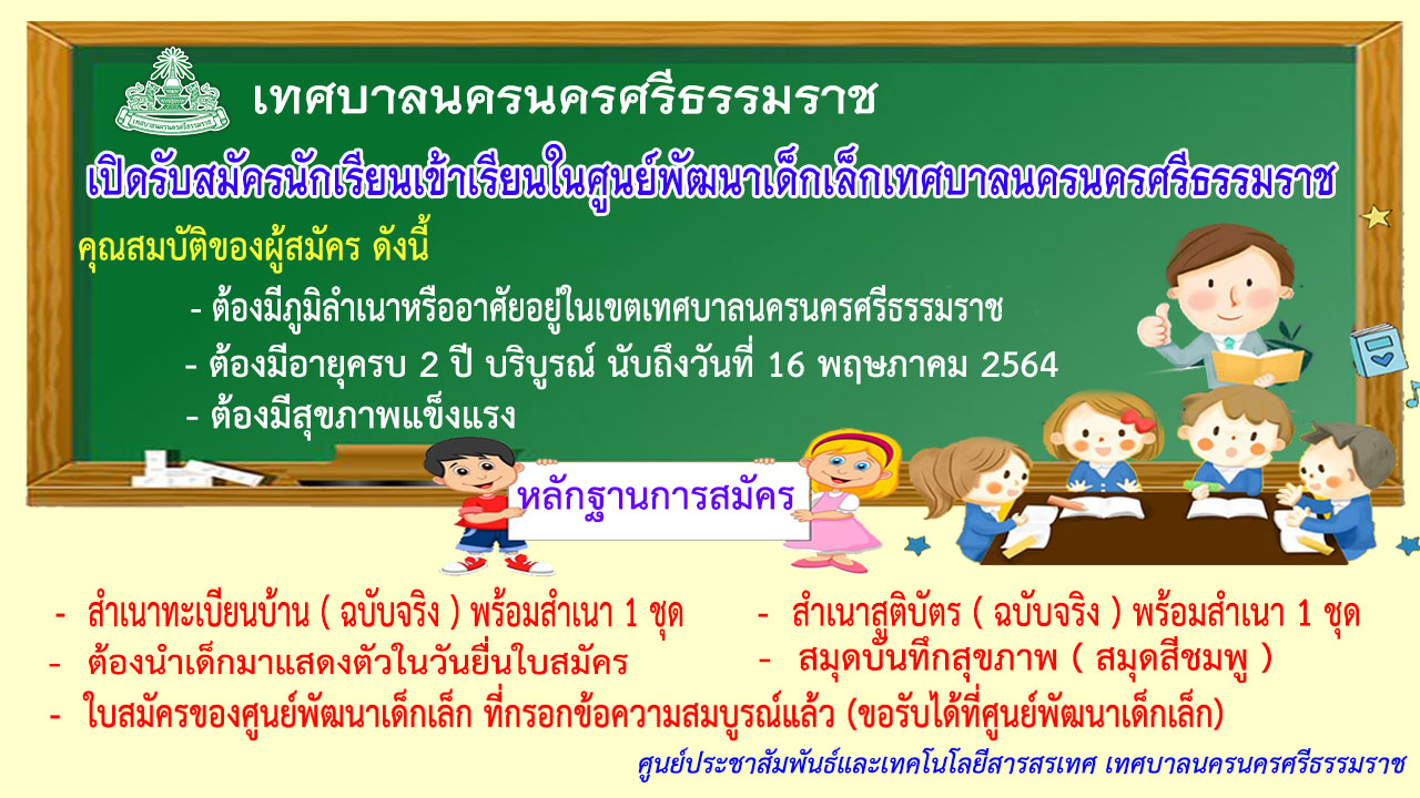 | ศูนย์พัฒนาเด็กเล็กเทศบาลนครนครศรีธรรมราช เปิดรับสมัครนักเรียน ประจำปีการศึกษา 2564 |