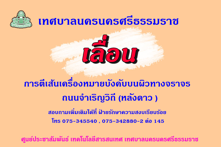 | เทศบาลนครนครศรีธรรมราช แจ้งเลื่อน การตีเส้นเครื่องหมายบังคับบนผิวทางจราจร ถนนจำเริญวิถี (หลังดาว ) เทศบาลนครนครศรีธรรมราช ภายใต้การนำของ นายชาคร ไอยศูรย์ ปลัดเทศบาล ปฏิบัติหน้าที่นายกเทศมนตรีนครนครศรีธรรมราช เลื่อน การตีเส้นเครื่องหมายบังคับบนผิวทางจราจร ถนนจำเริญวิถี (หลังดาว ) จากเดิมในวันที่ 24 - 27 มีนาคม 2564 เนื่องจากสภาพอากาศที่เปลี่ยนแปลง เกิดลมมรสุม ในช่วงฤดูร้อน ทำให้ฝนตกในพื้นที่ดังกล่าว ไม่สามารถดำเนินการตีเส้นเครื่องหมายบังคับบนผิวทางจราจร ได้ จึงขอเลื่อนการดำเนินการ จนกว่า สถานการณ์ปกติ จึงประชาสัมพันธ์ให้ทราบ สอบถามเพิ่มเติมได้ที่ ฝ่ายรักษาความสงบเรียบร้อย โทร 075-345540 , 075-342880-2 ต่อ 145 เทศบาลนครนครศรีธรรมราช จึงขออภัยในความไม่สะดวกมา ณ โอกาสนี้