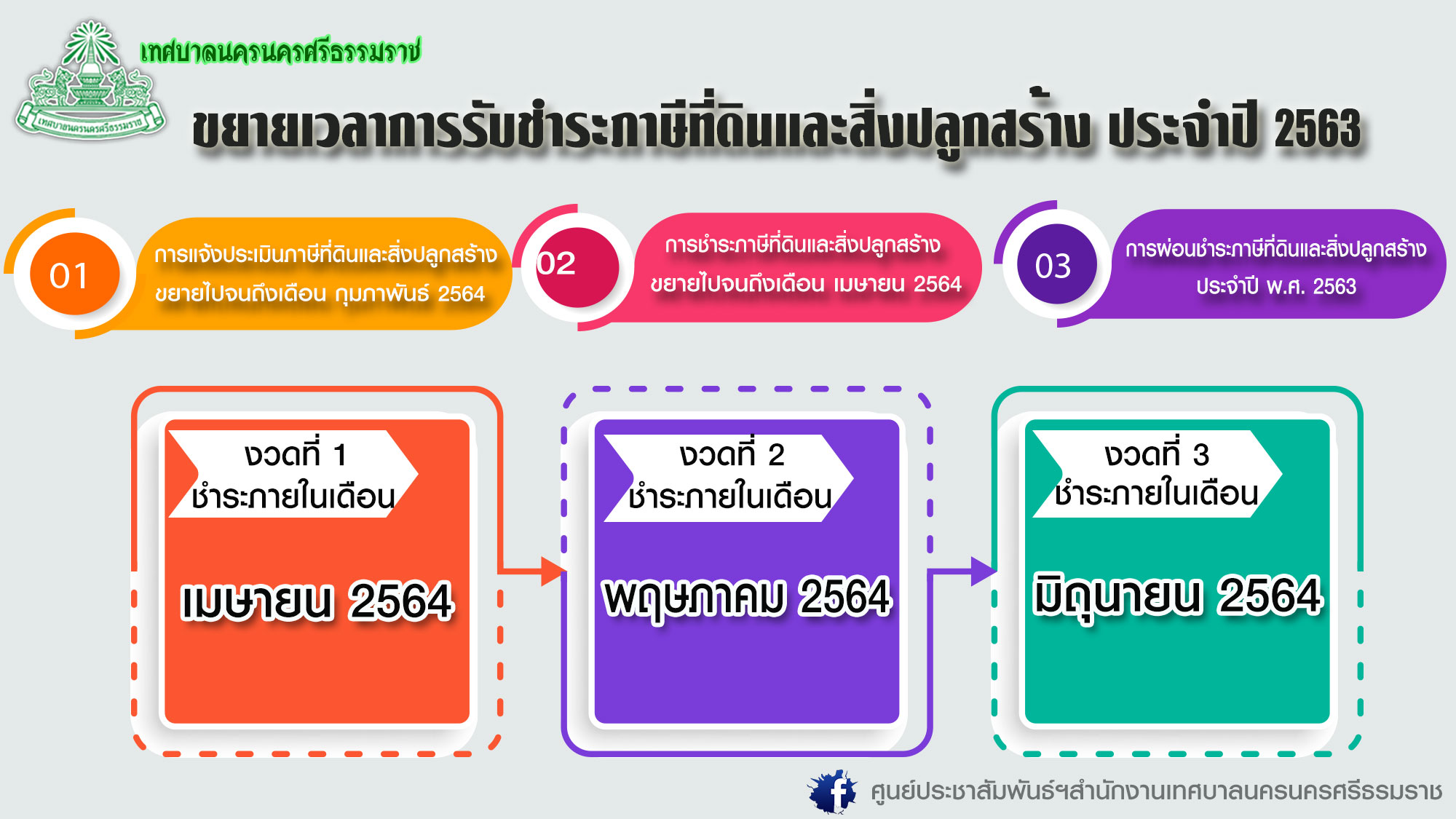 |   เทศบาลนครนครศรีธรรมราช   โดย ฝ่ายพัฒนารายได้ ส่วนพัฒนารายได้   สำนักการคลัง เทศบาลนครนครศรีธรรมราช  ได้ประกาศขยายเวลาการชำระภาษีที่ดินและสิ่งปลูกสร้าง  ประจำปี  พ.ศ. 2563   เพื่อเป็นการบรรเทาความเดือดร้อนของเจ้าของทรัพย์สิน ผู้มีหน้าที่ชำระภาษีที่ดินและสิ่งปลูกสร้าง ประจำปี  พ.ศ. 2563  ที่ได้รับผลกระทบจาก สถานการณ์การระบาดของโรคติดเชื้อไวรัสโคโรนา 2019 (COVID-19)  และเพื่อคงไว้ซึ่งสิทธิของผู้ชำระภาษี ประจำปี 2563  ดังนี้            ทั้งนี้ สอบถามรายละเอียดเพิ่มเติม ได้ที่  ฝ่ายพัฒนารายได้ ส่วนพัฒนารายได้   สำนักการคลัง เทศบาลนครนครศรีธรรมราช  โทรศัพท์  075-342880 -2   ต่อ 113   |