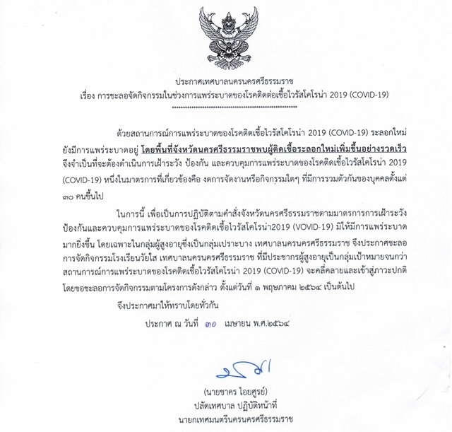 | เทศบาลนครนครศรีธรรมราช ภายใต้การนำของ  นายชาคร  ไอยศูรย์  ปลัดเทศบาล  ปฏิบัติหน้าที่นายกเทศมนตรีนครนครศรีธรรมราช  โดยกองสวัสดิการสังคม เทศบาลนครนครศรีธรรมราช ชะลอการจัดกิจกรรมโรงเรียนวัยใส เทศบาลนครนครศรีธรรมราช  ตั้งแต่วันที่ 1 พฤษภาคม 2564 จนกว่าสถานการณ์การแพร่ระบาดของโรคติดเชื้อไวรัสโคโรนา 2019 (COVID-19) จะคลี่คลายและเข้าสู่สภาวะปกติ ข่าว/แสงจันทร์ |
