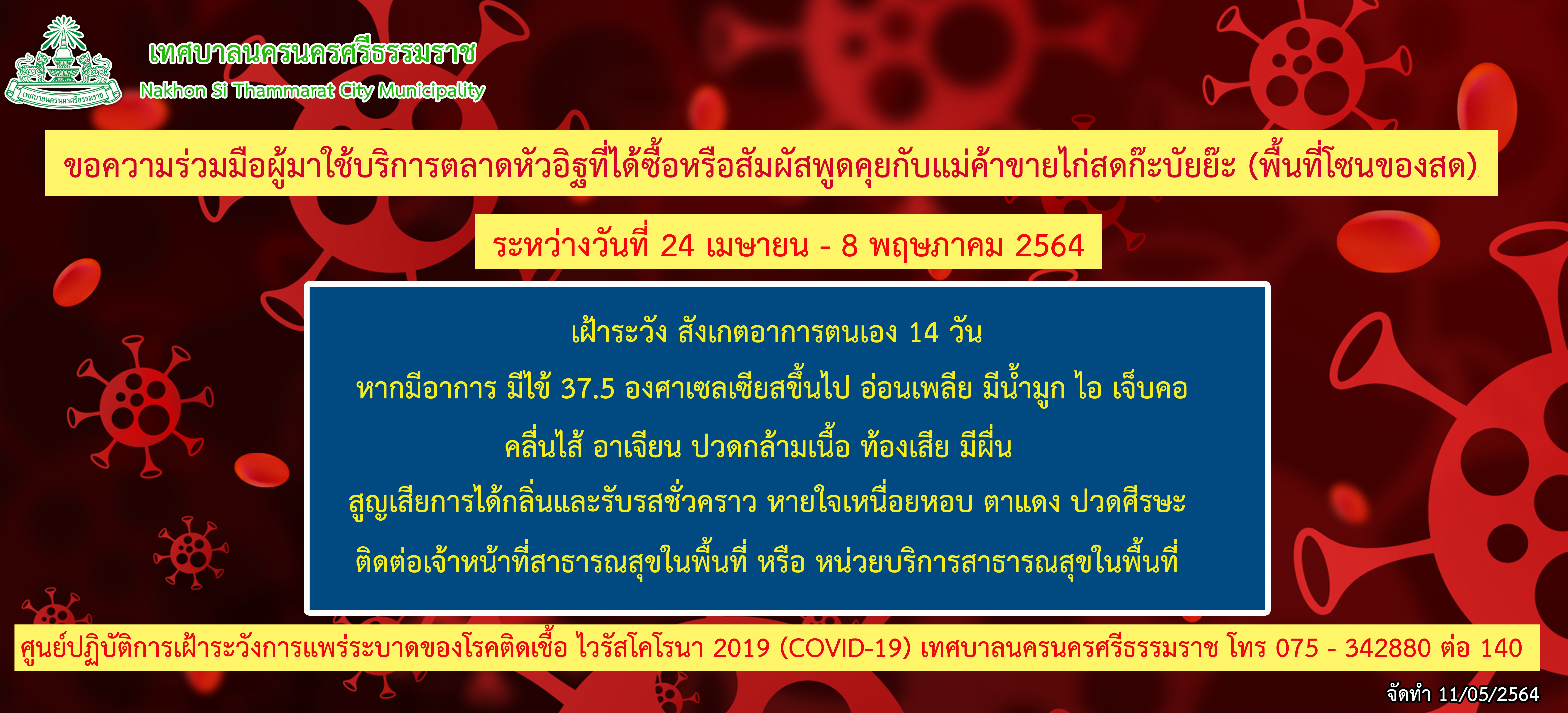 | เทศบาลนครนครศรีธรรมราช โดยกองสาธารณสุขและสิ่งแวดล้อม ขอความร่วมมือผู้มาใช้บริการตลาดสดหัวอิฐที่ได้ซื้อหรือสัมผัสพูดคุยกับแม่ค้าขายไก่สดก๊ะบัยย๊ะ (พื้นที่โซนของสด) ระหว่างวันที่ 24 เมาายน ถึง 8 พฤษภาคม 2564 เฝ้าระวังสังเกตอาการตนเอง 14 วัน หากมีอาการ มีไข้ 37.5 องศาเซลเซียส อ่อนเพลีย มีน้ำมูก ไอ เจ็บคอ คลื่นไส้ อาเจียน ปวดกล้ามเนื้อ ท้องเสีย มีผื่น สูญเสียการได้กลิ่นและรับรสชั่วคราว หายใจเหนื่อยหอบ ตาแดง ปวดศีรษะ ให้ติดต่อเจ้าหน้าที่สาธารณสุขในพื้นที่ หรือ หน่วยบริการสาธารณสุขในพื้นที่ |