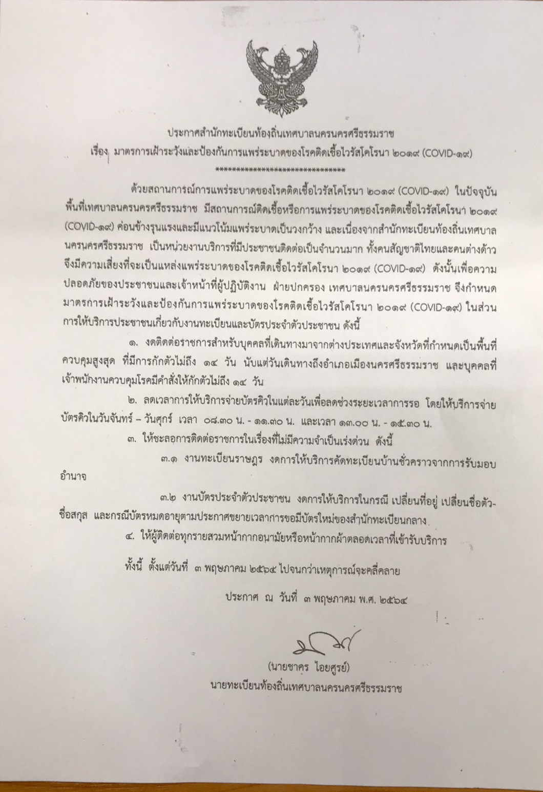 | สำนักทะเบียนท้องถิ่นเทศบาลนครนครศรีธรรมราช ประกาศเรื่องมาตรการเฝ้าระวังและป้องกัน การแพร่ระบาดของโรคติดเชื้อไวรัสโคโรนา 2019 (COVID -19) |