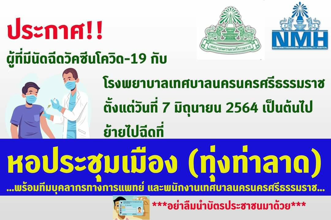 | เทศบาลนครนครศรีธรรมราช แจ้งสถานที่ฉีดวัคซีนโควิด-19 สำหรับ ประชาชนผู้ลงทะเบียนฉีดวัคซีน กับโรงพยาบาลเทศบาลนครนครศรีธรรมราช ให้ไปฉีดวัคซีน ณ หอประชุมเมืองเทศบาลนครนครศรีธรรมราช (ทุ่งท่าลาด) ตามวัน-เวลา ที่ท่านได้ลงทะเบียนไว้ |