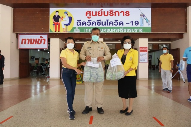 | นายสมคิด รักสนิท หัวหน้าฝ่ายบริหารงานทั่วไป โรงพยาบาลเทศบาลนครนครศรีธรรมราช เป็นตัวแทนรับมอบ อาหารว่าง สนับสนุนจากครอบครัว อุทยานนวาระ |