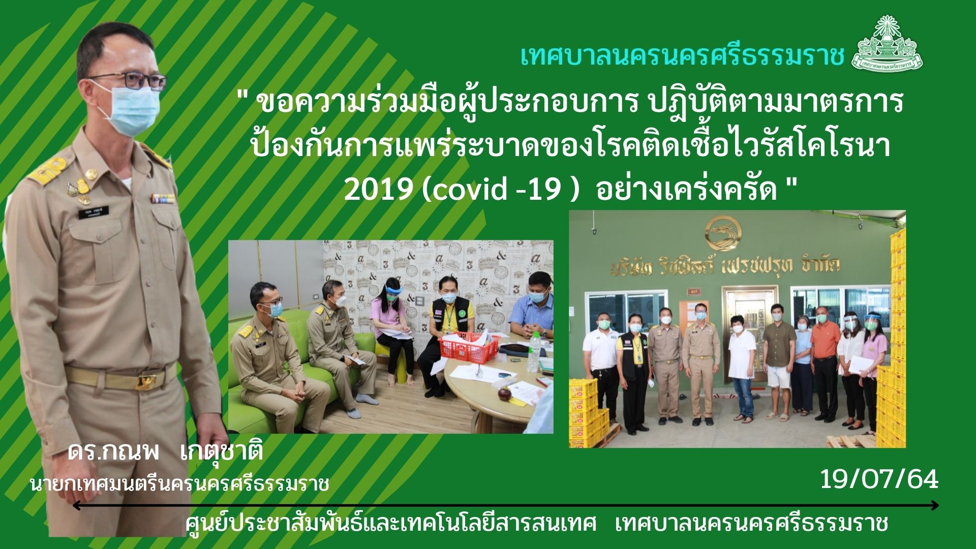 | ดร.กณพ เกตุชาติ นายกเทศมนตรีนครนครศรีธรรมราช ขอความร่วมมือ ให้กิจการปฎิบัติตามมาตรการป้องกันการแพร่ระบาดของโรคติดเชื้อไวรัสโคโรนา 2019 (covid -19 ) อย่างเคร่งครัด |