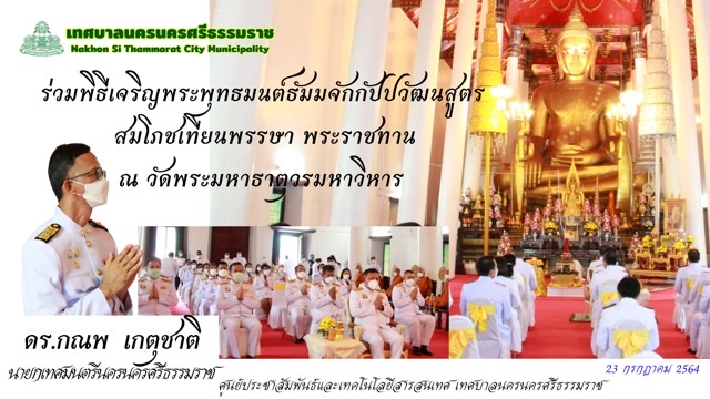 | ดร.กณพ เกตุชาติ นายกเทศมนตรีนครนครศรีธรรมราช ร่วมพิธีเจริญพระพุทธมนต์ธัมมจักกัปปวัตนสูตร สมโภชเทียนพรรษาพระราชทาน และพิธีถวายเทียนพรรษาพระราชทาน เนื่องในเทศกาลวันอาสาฬหบูชา-เข้าพรรษา ประจำปี 2564 |