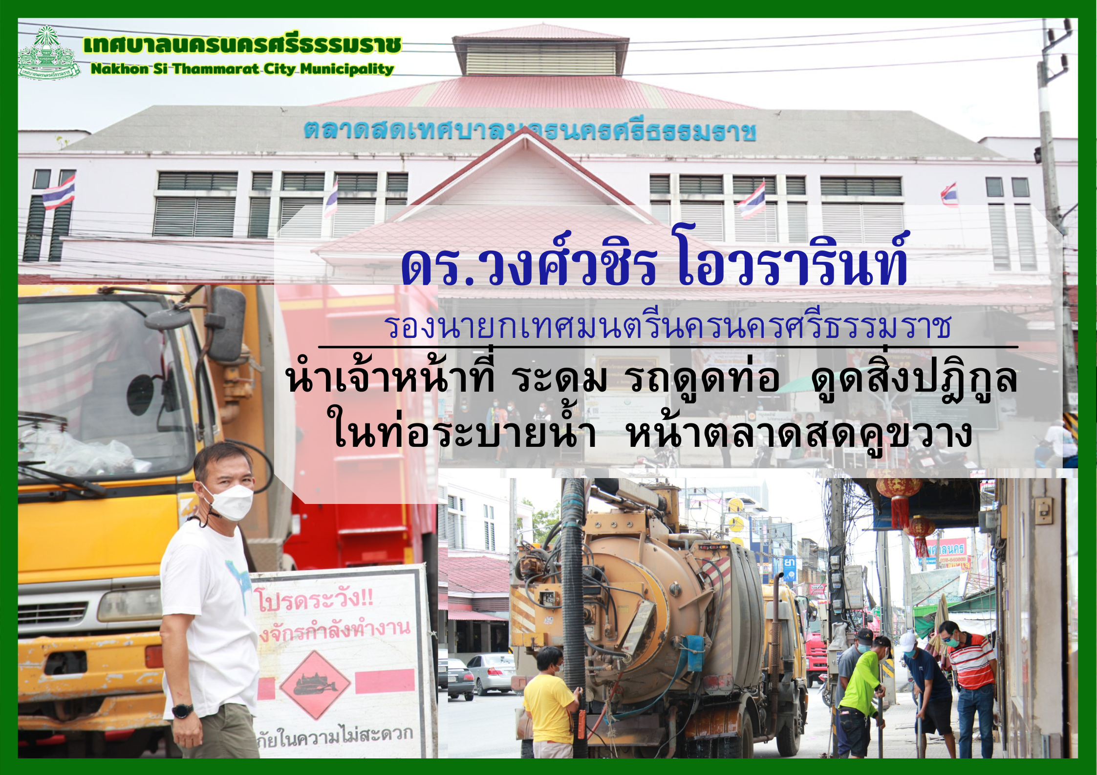 | ดร.วงศ์วชิร โอวรารินท์ รองนายกเทศมนตรีนครนครศรีธรรมราช ระดมรถดูดท่อ ฉีดล้างท่อระบายน้ำ และดูดสิ่งปฎิกูล ภายในท่อระบายน้ำ |
