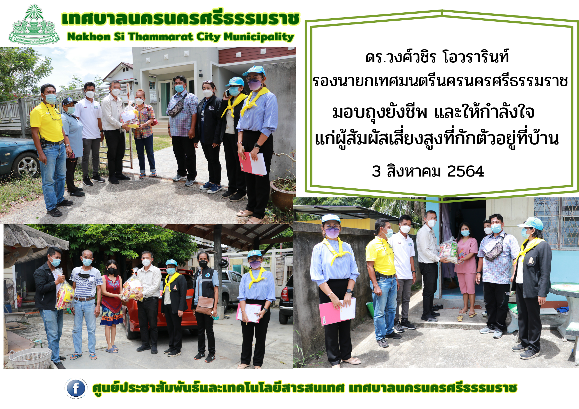 | ดร.วงศ์วชิร โอวรารินท์ รองนายกเทศมนตรีนครนครศรีธรรมราช พร้อมด้วยคณะผู้บริหาร เจ้าหน้าที่กองสวัสดิการสังคม ลงพื้นที่มอบถุงยังชีพ และให้กำลังใจ แก่ผู้สัมผัสเสี่ยงสูงที่กักตัวอยู่ที่บ้าน |