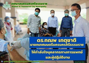 | วันอังคาร ที่ 3 สิงหาคม 2564 เวลา 15.00 น.  ดร.กณพ เกตุชาติ นายกเทศมนตรีนครนครศรีธรรมราช พร้อมด้วย ดร.ภาวินทร์ ณ พัทลุง รองนายกเทศมนตรีฯ และสมาชิกสภาเทศบาล เขต3  ลงพื้นที่ให้กำลังใจบุคลากรทางการแพทย์ และเจ้าหน้าที่ผู้ปฏิบัติงาน ศูนย์บริการฉีดวัคซีนโควิด-19 ณ หอประชุมเมืองนครศรีธรรมราช  |