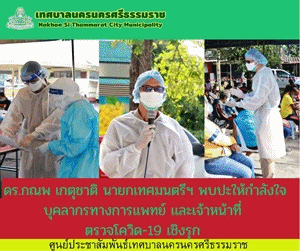 | นายกเทศมนตรีนครนครศรีธรรมราช ลงพื้นที่ให้กำลังใจเจ้าหน้าที่บุคลากรทางการแพทย์ และเจ้าหน้าที่เทศบาลที่ปฎิบัติงาน เชิงรุก ในการตรวจหาเชื้อไวรัสโคโรนา 2019 |