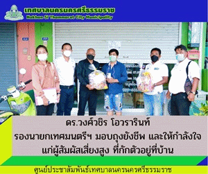 | รองนายกเทศมนตรีนครนครศรีธรรมราช ลงพื้นที่มอบถุงยังชีพ และให้กำลังใจ แก่ผู้สัมผัสเสี่ยงสูงที่กักตัวอยู่ที่บ้านตามคำสั่งคณะกรรมการควบคุมโรคจังหวัดนครศรีธรรมราช |