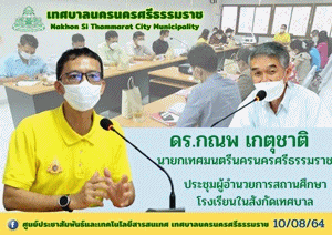 | วันอังคาร ที่10 สิงหาคม 2564 เวลา 10.00 น. ณ ห้องประชุมชั้น4 สำนักการศึกษา เทศบาลนครนครศรีธรรมราช ดร.กณพ เกตุชาติ นายกเทศมนตรีนครนครศรีธรรมราช พร้อมด้วย ดร.ภาวินทร์ ณ พัทลุง รองนายกเทศมนตรีฯ ประชุมผู้อำนวยการสถานศึกษาในสังกัดเทศบาล โดยมีวาระการประชุมดังนี้