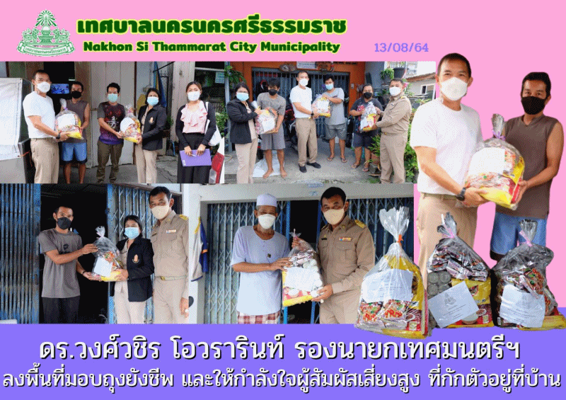 | วันศุกร์ ที่ 13 สิงหาคม 2564 เวลา 16.00-17.00 น. ดร.วงศ์วชิร โอวรารินท์ รองนายกเทศมนตรีนครนครศรีธรรมราช พร้อมด้วยนางอรนงค์ ชูลำภู ผอ.กองสวัสดิการสังคม นายจิณณ์ชยุต สาราพฤษ เลขานุการสภาเทศบาลนครนครศรีธรรมราช นายกฤษดา เสมอภพ สมาชิกสภาเทศบาล เขต2  และเจ้าหน้าที่กองสวัสดิการสังคม ลงพื้นที่มอบถุงยังชีพ และให้กำลังใจ แก่ผู้สัมผัสเสี่ยงสูงที่กักตัวอยู่ที่บ้าน ณ ซอยอิสลามพัฒนา ถนนพัฒนาการ ชุมชนสารีบุตร ชุมชนป่าโล่ง  ในเขตเทศบาลนครนครศรีธรรมราช |