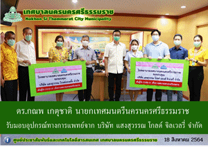 | วันพุธ ที่ 18 สิงหาคม 2564 เวลา 13.30 น. ณ สำนักงานเทศบาลนครนครศรีธรรมราช ดร.กณพ เกตุชาติ นายกเทศมนตรีนครนครศรีธรรมราช รับมอบอุปกรณ์ทางการแพทย์จาก บริษัท แสงสุวรรณ โกลด์ จิลเวลรี่ จำกัด เพื่อให้ทางโรงพยาบาลเทศบาลนครนครศรีธรรมราช ซึ่งเลงเห็นถึงความสำคัญของอุปกรณ์ป้องกันการติดเชื้อของไวรัสโคโรนา 2019