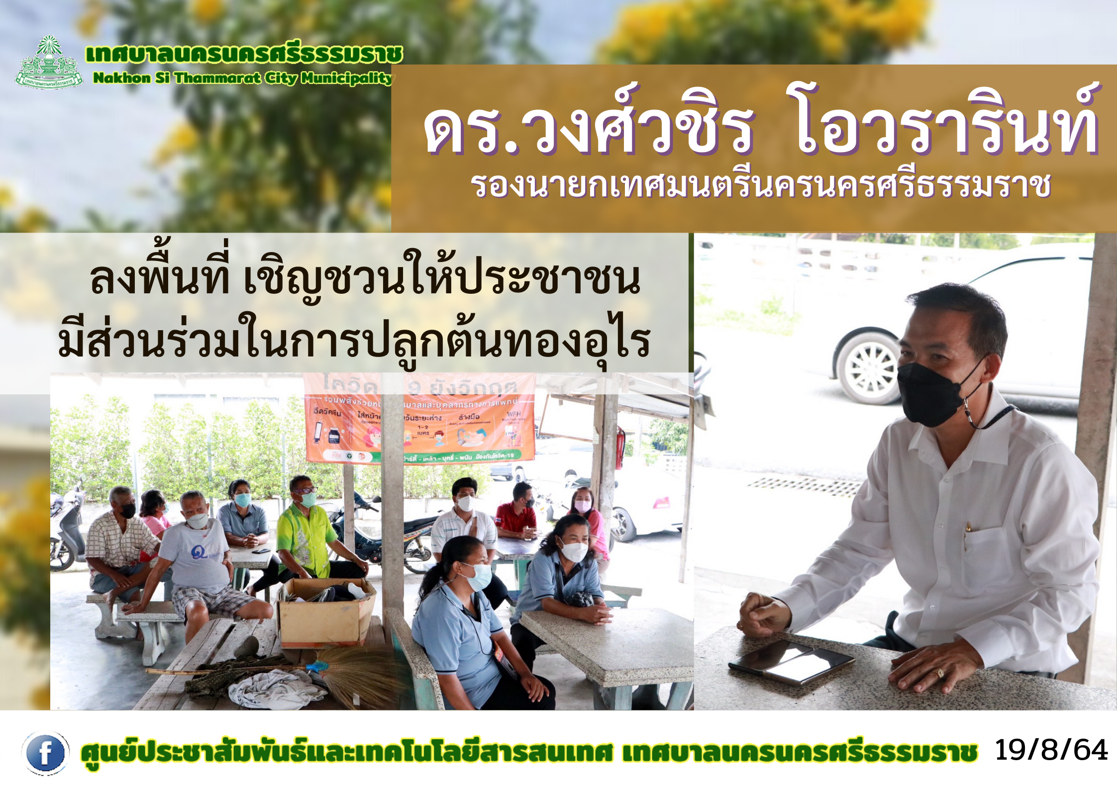 | ดร.วงศ์วชิร โอวรารินท์ รองนายกเทศมนตรีนครนครศรีธรรมราช พร้อมด้วย เจ้าหน้าที่กองสวัสดิการสังคม ลงพื้นที่รณรงค์เชิญชวนให้ประชาชนมีส่วนร่วมในการปลูกต้นทองอุไร |