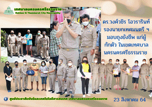 | วันจันทร์ ที่ 23 สิงหาคม 2564 เวลา 13.00 น. ณ เขตเทศบาลนครนครศรีธรรมราช ดร.วงศ์วชิร โอวรารินท์ รองนายกเทศมนตรีนครนครศรีธรรมราช พร้อมด้วยคณะผู้บริหาร เจ้าหน้าที่กองสวัสดิการสังคม ลงพื้นที่มอบถุงยังชีพ และให้กำลังใจ แก่ผู้สัมผัสเสี่ยงสูงที่กักตัวอยู่ที่บ้านตามคำสั่งคณะกรรมการควบคุมโรคจังหวัดนครศรีธรรมราช