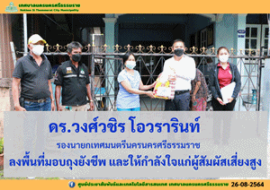| วันพฤหัสบดี ที่ 26 สิงหาคม 2564 เวลา 14.00 น. ณ เขตเทศบาลนครนครศรีธรรมราช ดร.วงศ์วชิร โอวรารินท์ รองนายกเทศมนตรีนครนครศรีธรรมราช พร้อมด้วยคณะผู้บริหาร เจ้าหน้าที่กองสวัสดิการสังคม ลงพื้นที่มอบถุงยังชีพ และให้กำลังใจ แก่ผู้สัมผัสเสี่ยงสูงที่กักตัวอยู่ที่บ้านตามคำสั่งคณะกรรมการควบคุมโรคจังหวัดนครศรีธรรมราช