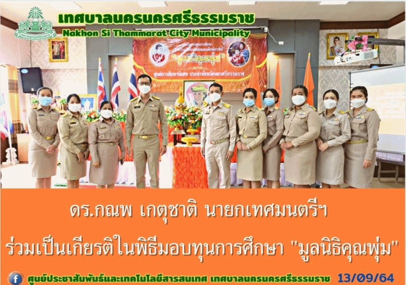 | ดร.กณพ เกตุชาติ นายกเทศมนตรีฯ ร่วมเป็นเกียรติในพิธีมอบทุนการศึกษา “มูลนิธิคุณพุ่ม” จังหวัดนครศรีธรรมราช ปีการศึกษา 2564 |