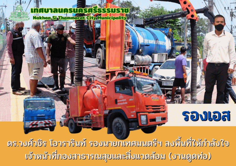 | ดร.วงศ์วชิร โอวรารินท์ รองนายกเทศมนตรีนครนครศรีธรรมราช ลงพื้นที่ให้กำลังใจเจ้าหน้าที่กองสาธารณสุขและสิ่งแวดล้อม(งานดูดท่อ) |