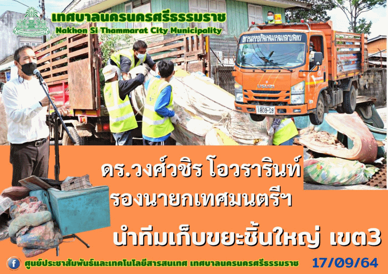 | ดร.วงศ์วชิร โอวรารินท์ รองนายกเทศมนตรีนครนครศรีธรรมราช นำสมาชิกสภาเทศบาลและเจ้าหน้าที่ ลงพื้นที่เก็บขยะชิ้นใหญ่ เขต 3 |