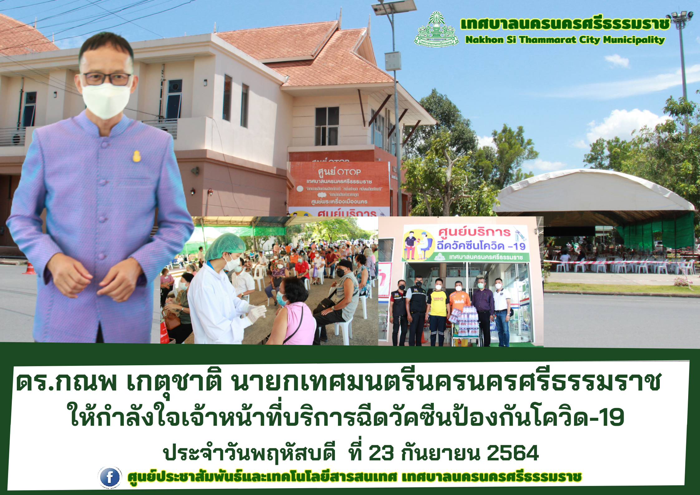 วันพฤหัสบดี ที่ 23 กันยายน พ.ศ. 2564 ตั้งแต่เวลา 08.30 -16.00 น. ณ ศูนย์โอทอป สวนสาธารณะศรีธรรมาโศกราช ดร.กณพ เกตุชาติ นายกเทศมนตรีนครนครศรีธรรมราช พร้อมด้วยคธผู้บริหาร สมาชิกสภาเทศบาลนครนครศรีธรรมราช ลงพื้นที่ ให้กำลังใจเจ้าหน้าที่ ผู้ปฎิบัติงาน บริการฉีดวัคซีนป้องกันโรคโควิด-19 สำหรับผู้ฉีดวัคซีน Sinovac เข็มที่ 1 จำนวน 517 คน และวัคซีน AstraZeneca เข็มที่ 2 จำนวน 479 คน ตามกำหนดการในระบบหมอพร้อม ซึ่งในวันนี้ มูลนิธิ “ ใต้เต็กตึ๊ง”นครศรีธรรมราช มอบน้ำดื่มจำนวน 30 แพ็ค ให้แก่บุคลากรทางการแพทย์และผู้ปฏิบัติงาน ทั้งนี้ สอบถามเพิ่มเติมได้ที่ 075-356014 ต่อ 0 – 088-2620737, 088-2620738 ในวันและเวลาราชการ ตั้งแต่เวลา 08.30 น.-15.30 น. ข่าว/แสงจันทร์