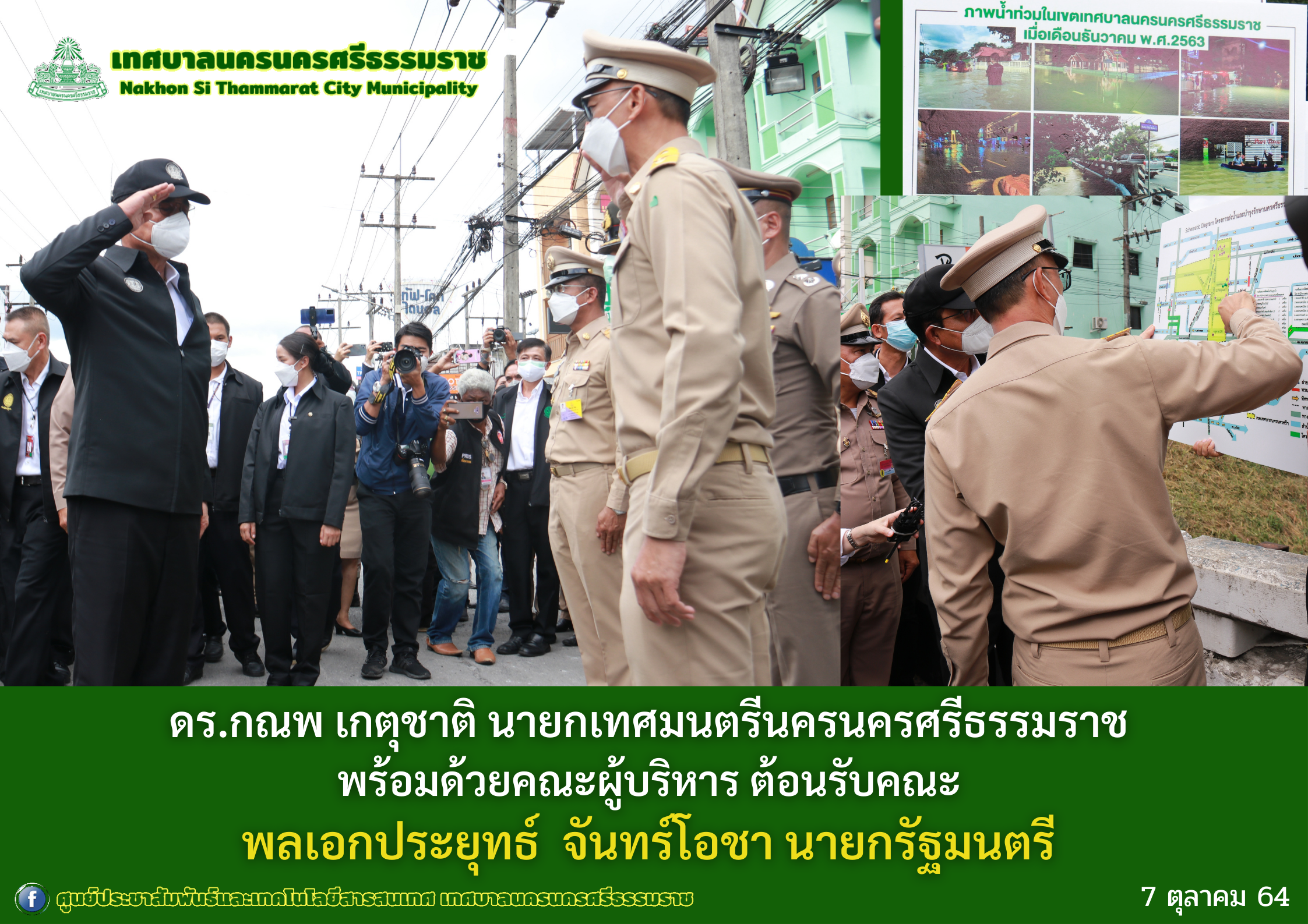 | ดร.กณพ เกตุชาติ นายกเทศมนตรีนครนครศรีธรรมราช พร้อมด้วยคณะผู้บริหาร ต้อนรับคณะ พลเอกประยุทธ์ จันทร์โอชา นายกรัฐมนตรี ในการติดตามการบริหารจัดการน้ำ ในพื้นที่เทศบาลนครนครศรีธรรมราช |