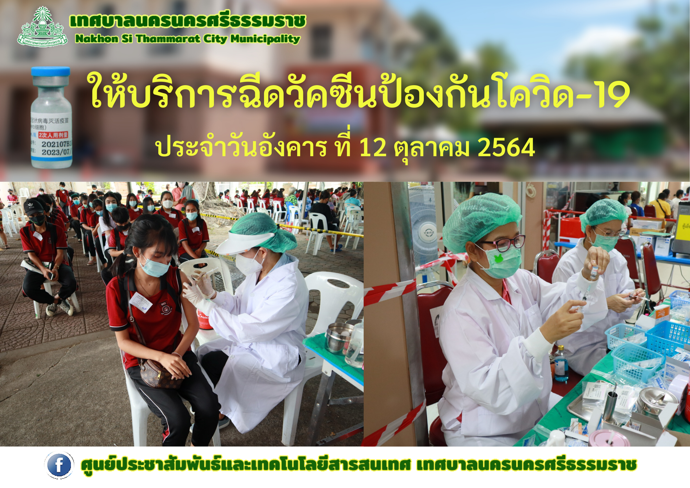 | เทศบาลนครนครศรีธรรมราช ให้บริการฉีดวัคซีนป้องกันโรคโควิด-19 ประจำวันอังคาร ที่ 12 ตุลาคม 2564 |