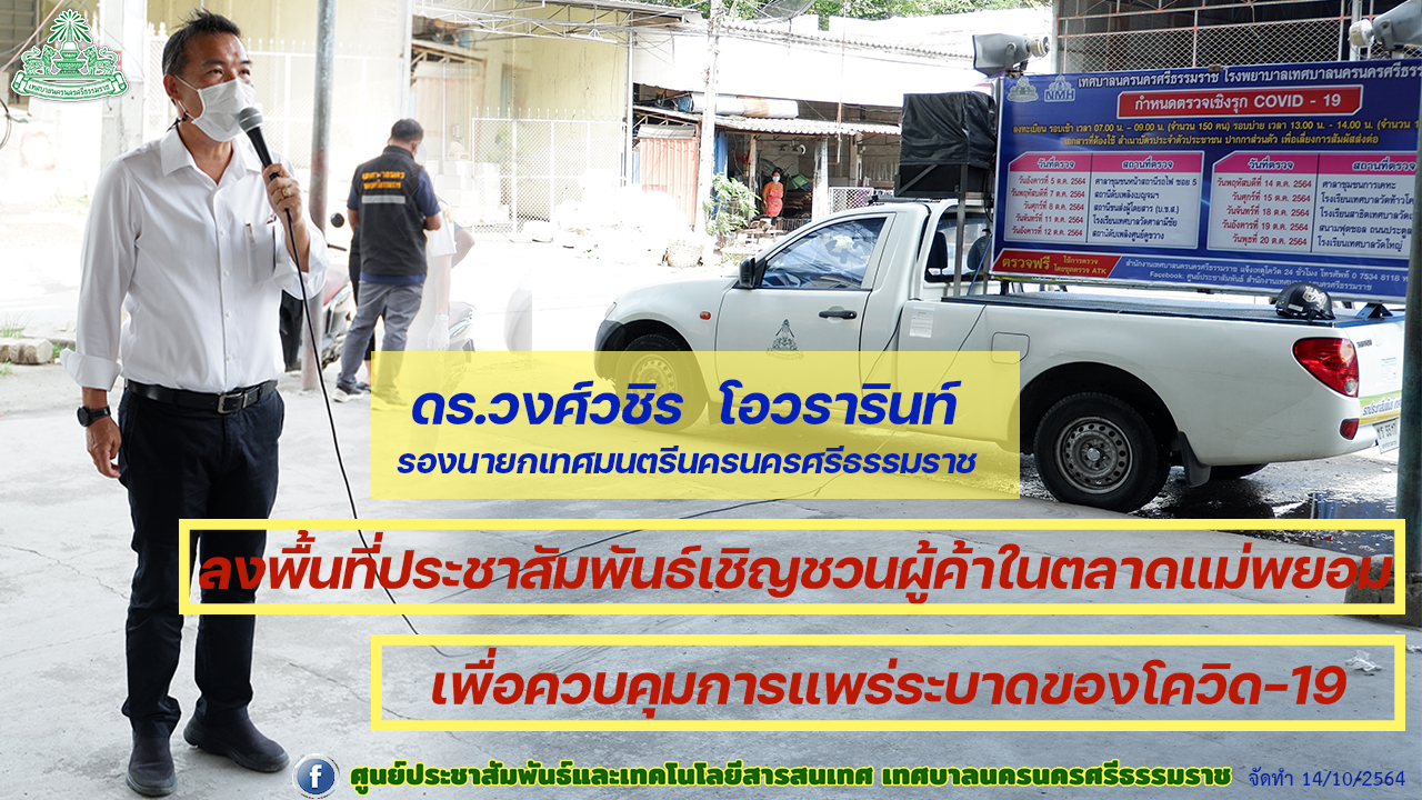 | วันพฤหัสบดีที่ 14 ตุลาคม 2564 เวลา 10.00 น. ณ ตลาดกลางการเกษตรหัวอิฐ (ตลาดแม่พยอม) ดร.กณพ เกตุชาติ นายกเทศมนตรีนครนครศรีธรรมราช มอบหมายให้ ดร.วงศ์วชิร โอวรารินท์ รองนายกเทศมนตรีนครนครศรีธรรมราช พร้อมด้วยเจ้าหน้าที่กองสาธารณสุขและสิ่งแวดล้อม ลงพื้นที่ เพื่อสอบโรคในพื้นที่เสี่ยงต่อการติดเชื้อในตลาดแม่พยอม และประชาสัมพันธ์เข้ารับการตรวจหาเชื้อโควิด-19 เพื่อควบคุมการแพร่ระบาดของโรคในกลุ่มผู้ประกอบการ และพื้นที่โดยรอบ