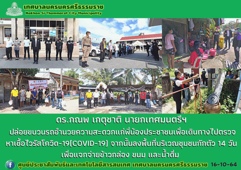 | ดร.กณพ เกตุชาติ นายกเทศมนตรีนครนครศรีธรรมราช ปล่อยขบวนรถในการอำนวยความสะดวกแก่พี่น้องประชาชนเพื่อเดินทางไปตรวจหาเชื้อไวรัสโควิด-19 (COVID-19) |