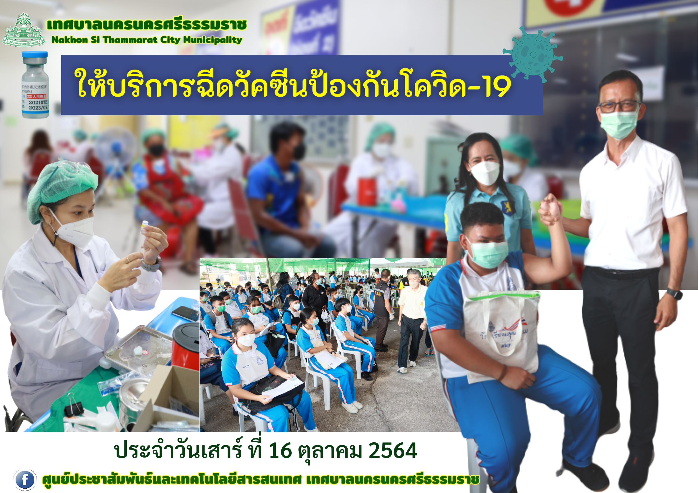 | เทศบาลนครนครศรีธรรมราช ให้บริการฉีดวัคซีนป้องกันโรคโควิด-19 ประจำวันเสาร์ ที่ 16 ตุลาคม 2564 วันเสาร์ ที่ 16 ตุลาคม 2564 ตั้งแต่เวลา 08.30 -16.00 น. ณ ศูนย์ OTOP สวนสาธารณะศรีธรรมาโศกราช ดร.กณพ เกตุชาติ นายกเทศมนตรีนครนครศรีธรรมราช พร้อมด้วยคณะผู้บริหาร  ลงพื้นที่ให้กำลังใจเจ้าหน้าที่ ผู้ปฏิบัติงาน ดำเนินการฉีดวัคซีนป้องกันโรคโควิด-19 |