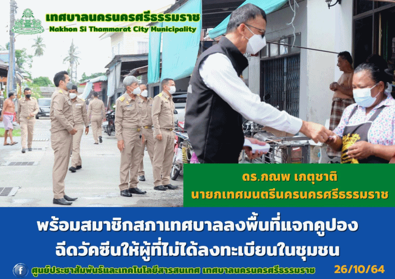 | ดร.กณพ เกตุชาติ นายกเทศมนตรีนครนครศรีธรรมราช ลงพื้นที่แจกคูปองฉีดวัคซีนป้องกันโควิด-19 ให้ผู้ที่ไม่ได้ลงทะเบียนในชุมชน |