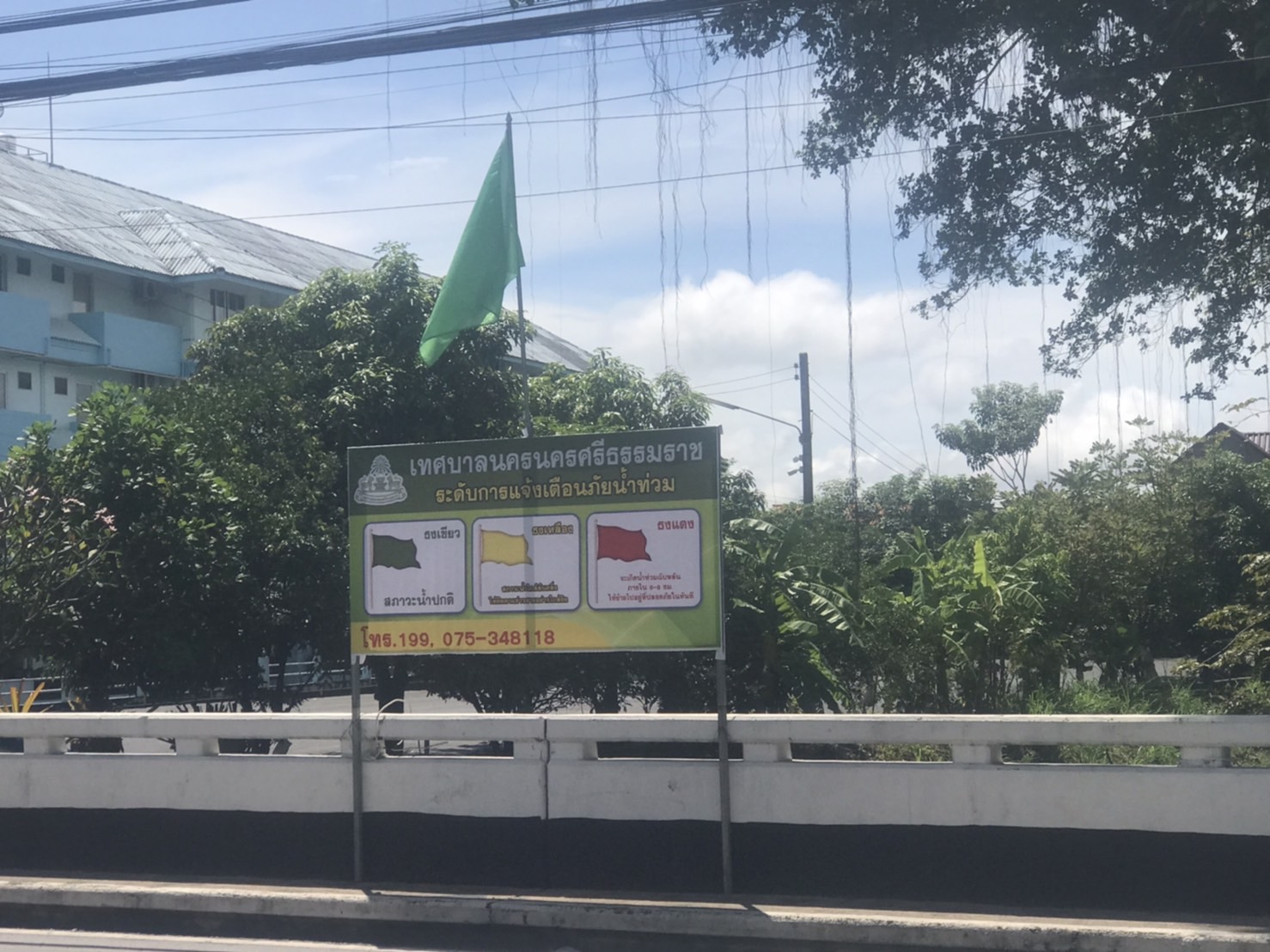 | เทศบาลนครนครนครศรีธรรมราช เตรียมพร้อมรับสถานการณ์น้ำท่วมและน้ำล้นตลิ่ง ติดตั้งป้ายเตือนภัยพร้อมปักธงตามจุดต่าง ๆ ของลำคลองทุกสายที่ผ่านตัวเมืองนครศรีธรรมราช ขณะนี้ระดับน้ำยังอยู่ในเกณฑ์ปกติ ได้มีการปักธงสีเขียว |