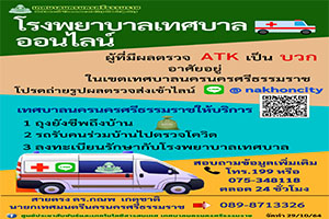 | โรงพยาบาลเทศบาลออนไลน์ สำหรับผู้ที่มีผลตรวจ ATK เป็นบวก อาศัยอยู่ในเขตเทศบาลนครนครศรีธรรมราช โปรดถ่ายรูปผลตรวจส่งเข้าไลน์ @ Nakhoncity เทศบาลนครนครศรีธรรมราชให้บริการ 1 ถุงยังชีพถึงบ้าน 2 รถรับคนร่วมบ้านไปตรวจโควิด 3 ลงทะเบียนรักษากับโรงพยาบาลเทศบาล สอบถามข้อมูลเพิ่มเติม โทร.199 หรือ 075-348118 ตลอด 24 ชั่วโมง หรือ สายตรง ดร.กณพ เกตุชาติ นายกเทศมนตรีนครนครศรีธรรมราช 089-8713326