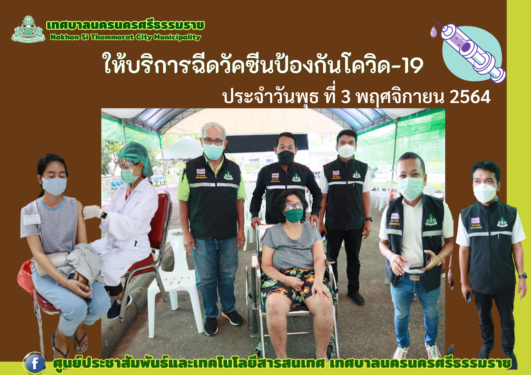 | เทศบาลนครนครศรีธรรมราช ให้บริการฉีดวัคซีนป้องกันโรคโควิด-19 ประจำวันพุธ ที่ 3 พฤศจิกายน 2564 |