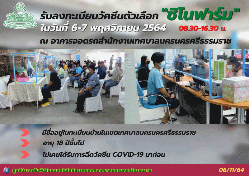 | วันเสาร์ ที่6 พฤศจิกายน 2564 ดร.กณพ เกตุชาติ นายกเทศมนตรีนครนครศรีธรรมราช มอบหมายให้ เจ้าหน้าที่สำนักปลัดเทศบาล เจ้าหน้าที่ศูนย์ ICT สังกัดกองยุทธศาสตร์และงบประมาณ และเจ้าหน้าที่งานทะเบียนราษฎร์ รับลงทะเบียน และตรวจสอบข้อมูลสิทธิการได้รับวัคซีนตัวเลือก “ซิโนฟาร์ม” สามารถลงทะเบียนได้ภายในวันที่ 6-7 พฤศจิกายน 2564 เวลา 08.30 น.-16.30 น.ณ อาคารจอดรถเทศบาลนครนครศรีธรรมราช ทั้งนี้ผู้ที่สามารถลงทะเบียนได้ต้องมีคุณสมบัติ ดังนี้
