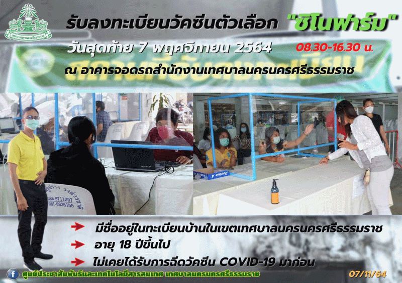 | วันอาทิตย์ ที่7 พฤศจิกายน 2564 ดร.กณพ เกตุชาติ นายกเทศมนตรีนครนครศรีธรรมราช พร้อมด้วย นายธวัช ศรีสมานุวัตร สมาชิกสภาเทศบาล เขต2 ลงพื้นที่ให้กำลังใจเจ้าหน้าที่สำนักปลัดเทศบาล เจ้าหน้าที่ศูนย์ ICT สังกัดกองยุทธศาสตร์และงบประมาณ และเจ้าหน้าที่งานทะเบียนราษฎร์ ในการรับลงทะเบียน และตรวจสอบข้อมูลสิทธิการได้รับวัคซีนตัวเลือก “ซิโนฟาร์ม” ณ อาคารจอดรถเทศบาลนครนครศรีธรรมราช สามารถลงทะเบียนได้ภายในวันที่ 6-7 พฤศจิกายน 2564 เวลา 08.30 น.-16.30 น. ทั้งนี้ผู้ที่สามารถลงทะเบียนได้ต้องมีคุณสมบัติ ดังนี้