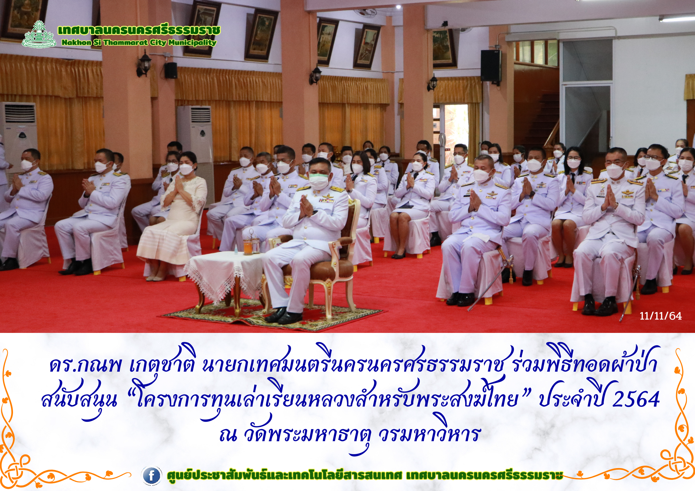 | วันนี้ (11 พฤศจิกายน 2564) ดร.กณพ เกตุชาติ นายกเทศมนตรีนครนครศรธรรมราช ร่วมพิธีทอดผ้าป่าสนับสนุน “โครงการทุนเล่าเรียนหลวงสำหรับพระสงฆ์ไทย” ประจำปี 2564 ที่ศาลา 100 ปี วัดพระมหาธาตุวรมหาวิหาร ตำบลในเมือง อำเภอเมืองนครศรีธรรมราช จังหวัดนครศรีธรรมราช เพื่อ น้อมเกล้าน้อมกระหม่อมถวายพระราชกุศลแด่ พระบาทสมเด็จพระบรมชนกาธิเบศร มหาภูมิพลอดุลยเดชมหาราช บรมนาถบพิตร เนื่องในวันคล้ายวันสวรรคต 13 ตุลาคม โดยมี พระเทพวินยาภรณ์ เจ้าอาวาสวัดพระมหาธาตุ วรมหาวิหาร จังหวัดนครศรีธรรมราช และรองเจ้าคณะภาค 16-17-18 (ธ) เป็นประธานฝ่ายสงฆ์ โดยนายไกรศร วิศิษฎ์วงศ์ ผู้ว่าราชการจังหวัดนครศรีธรรมราช เป็นประธานในพิธี พร้อมด้วย ข้าราชการ หน่วยงานภาครัฐ เอกชน ร่วมในพิธีภายใต้โครงการมาตรการป้องกันโรคโควิด-19 อย่างเคร่งครัด สำหรับโครงการทุนเล่าเรียนหลวงสำหรับพระสงฆ์ไทย พระบาทสมเด็จพระเจ้าอยู่หัว ทรงพระกรุณาโปรดเกล้าโปรดกระหม่อม พระราชทาน พระบรมราชานุญาต ให้วัดทุกวัดทั่วประเทศจัดพิธีทอดผ้าป่า เพื่อสนับสนุนการดำเนินงานของโครงการทุนเล่าเรียนหลวงสำหรับพระสงฆ์ไทย ซึ่งยอดเงินจากการทอดผ้าป่าในวันนี้ รวมเป็นเงิน 1,017,036.50 บาท