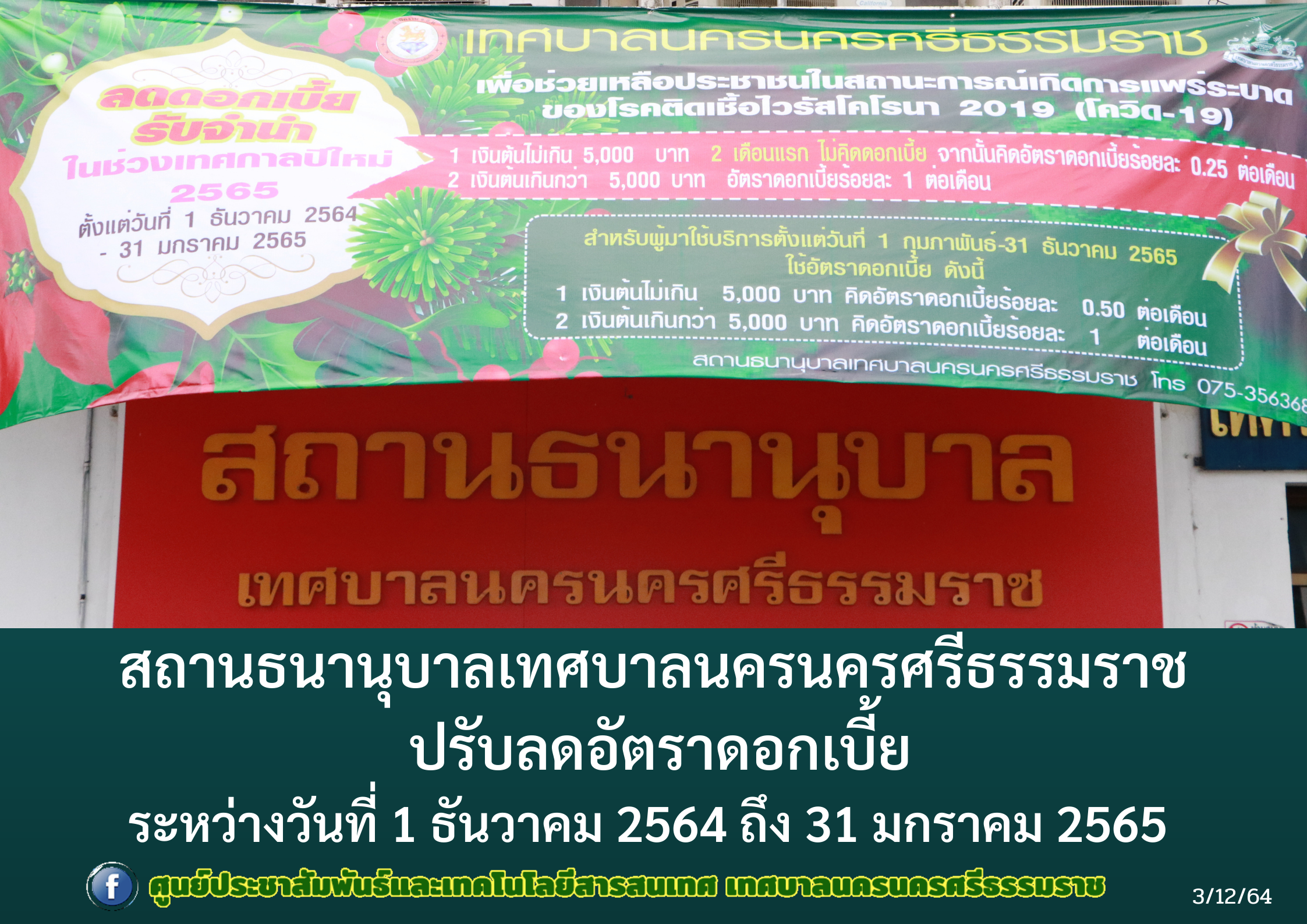 | สถานธนานุบาลเทศบาลนครนครศรีธรรมราช ปรับลดอัตราดอกเบี้ยสำหรับผู้มาใช้บริการระหว่างวันที่ 1 ธันวาคม 2564 ถึง 31 มกราคม 2565 |