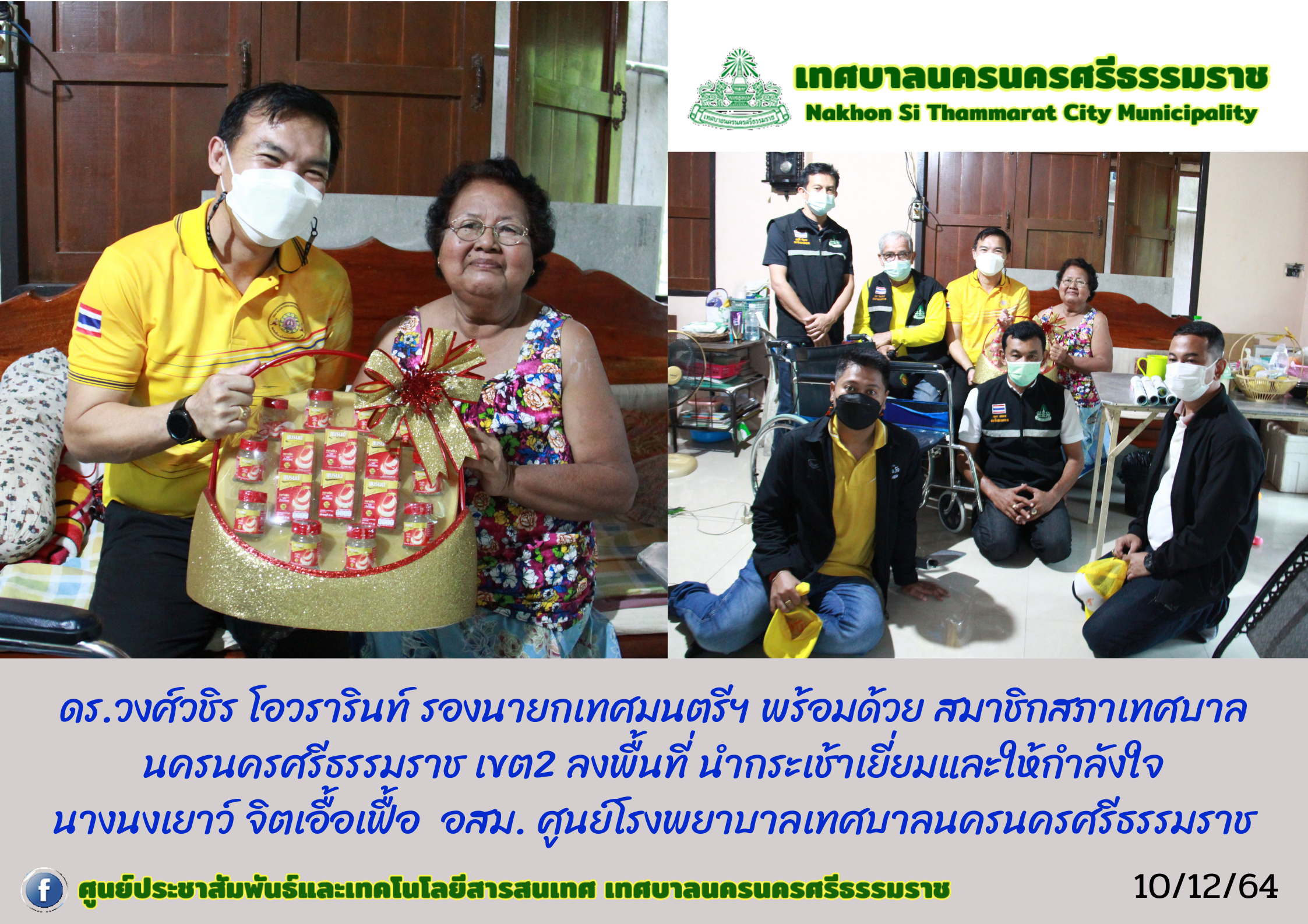 | ดร.วงศ์วชิร โอวรารินท์ รองนายกเทศมนตรีนครนครศรีธรรมราช พร้อมด้วย สมาชิกสภาเทศบาลนครนครศรีธรรมราช เขต2 ลงพื้นที่ นำกระเช้าเยี่ยมและให้กำลังใจ นางนงเยาว์ จิตเอื้อเฟื้อ อสม. ศูนย์โรงพยาบาลเทศบาลนครนครศรีธรรมราช |