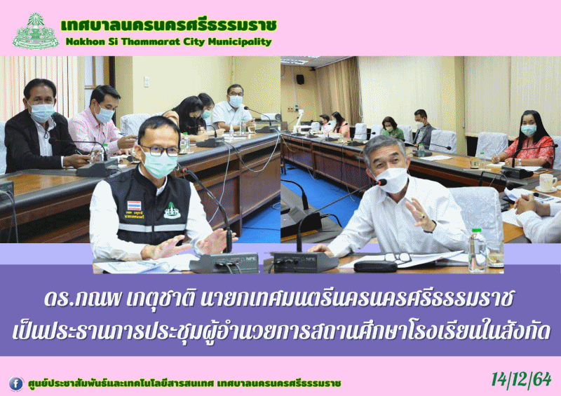 | วันอังคาร  ที่ 14  ธันวาคม  2564  เวลา 10.00 น. ณ ห้องประชุมชั้น2 สำนักงานเทศบาลนครนครศรีธรรมราช  ดร.กณพ  เกตุชาติ  นายกเทศมนตรีนครนครศรีธรรมราช  เป็นประธานประชุมผู้อำนวยการสถานศึกษาโรงเรียนในสังกัด |