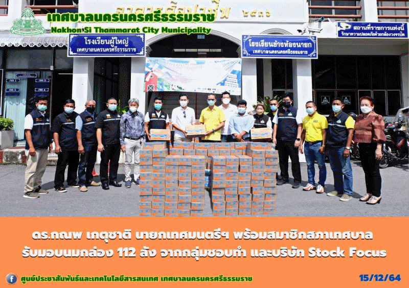 | วันพุธ ที่15 ธันวาคม 2564 เวลา 11.30 น. ดร.กณพ เกตุชาติ นายกเทศมนตรีนครนครศรีธรรมราช พร้อมด้วยหัวหน้าส่วน สมาชิกสภาเทศบาล รับมอบนมกล่อง UHT 4000 กล่อง จำนวน (112 ลัง)  จากคณะกลุ่มชอบทำ และบริษัท Stock Focus  เพื่อแจกจ่ายให้กับเด็กในชุมชนเขตเทศบาลนครนครศรีธรรมราช ต่อไป |