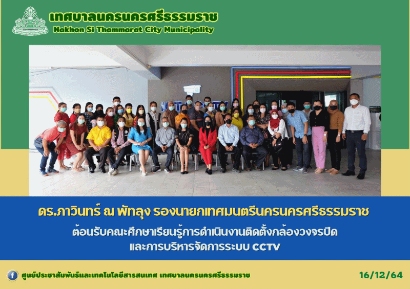 | ดร.ภาวินทร์ ณ พัทลุง รองนายกเทศมนตรีนครนครศรีธรรมราช ต้อนรับคณะศึกษาเรียนรู้การดำเนินงานติดตั้งกล้องวงจรปิดและการบริหารจัดการระบบ CCTV |
