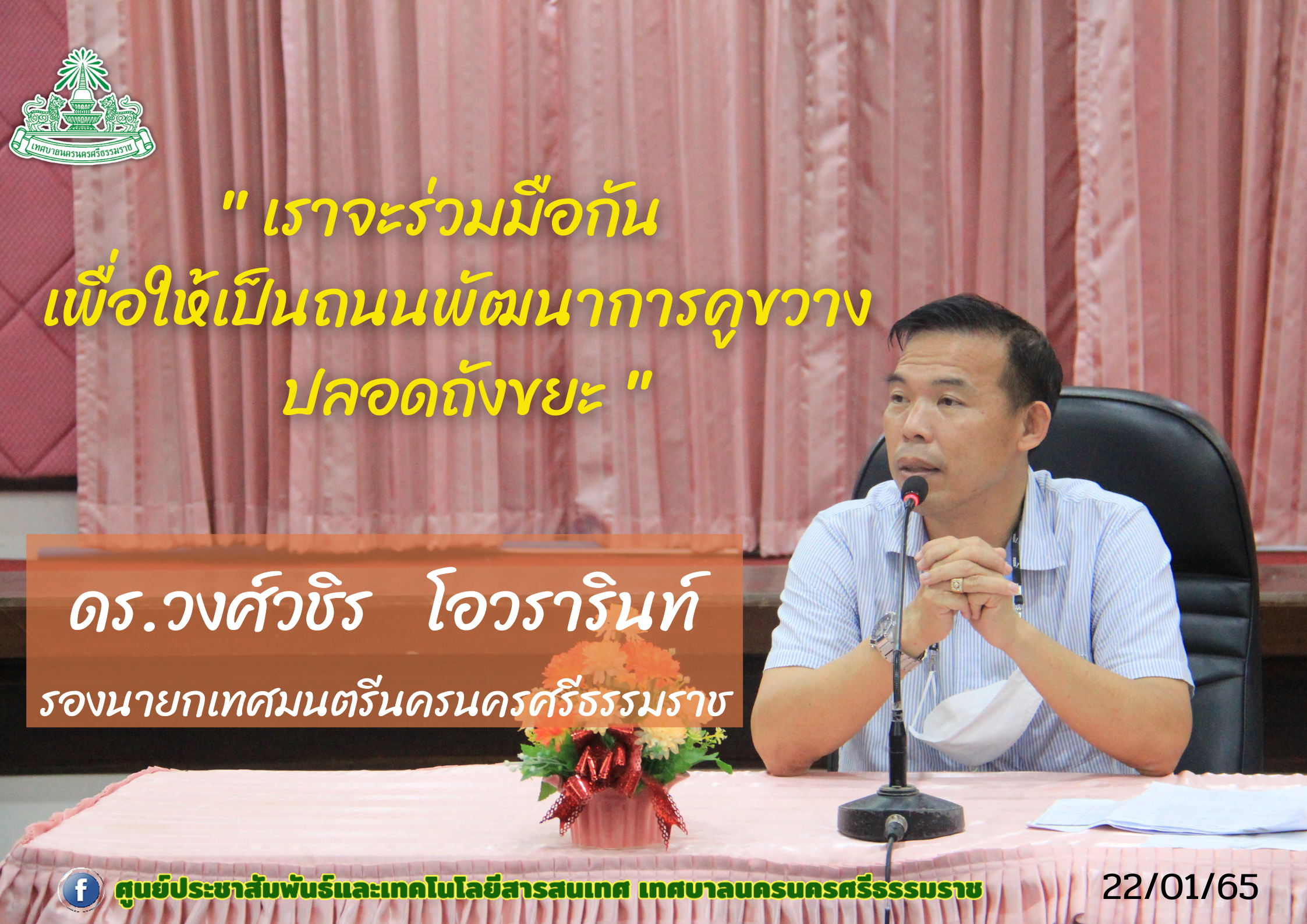 | ดร.วงศ์วชิร โอวรารินท์ รองนายกเทศมนตรีนครนครศรีธรรมราช เป็นประธานประชุมปรึกษาหารือกำหนดจุดทิ้งขยะ ให้กับผู้ประกอบการร้านอาหารและร้านค้า ช่วงเวลากลางคืน ตั้งแต่บริเวณสี่แยกคูขวาง -สามแยกนาหลวง (ถนนพัฒนาการคูขวาง ) วันเสาร์ ที่ 22 มกราคม 2565 เวลา 11.00 น. ณ ห้องประชุมชั้น5 สำนักงานเทศบาลนครนครศรีธรรมราช ดร.วงศ์วชิรโอวรารินท์ รองนายกเทศมนตรีนครนครศรีธรรมราช เป็นประธานประชุมปรึกษาหารือกำหนดจุดทิ้งขยะ และ การคัดแยกขยะ ให้มีระบบการจัดการขยะที่ดีควบคุมปริมาณมูลฝอยและเพิ่มประสิทธิภาพในการจัดการขยะ ให้กับผู้ประกอบการร้านอาหารและร้านค้า ช่วงเวลากลางคืน ตั้งแต่บริเวณสี่แยกคูขวาง -สามแยกนาหลวง (ถนนพัฒนาการคูขวาง ) เพื่อขอความร่วมมือทิ้งขยะในช่วงเวลา 19.00 น.- 21.00 น. เริ่มตั้งแต่ 1 กุมภาพันธ์ 2565 เป็นต้นไป