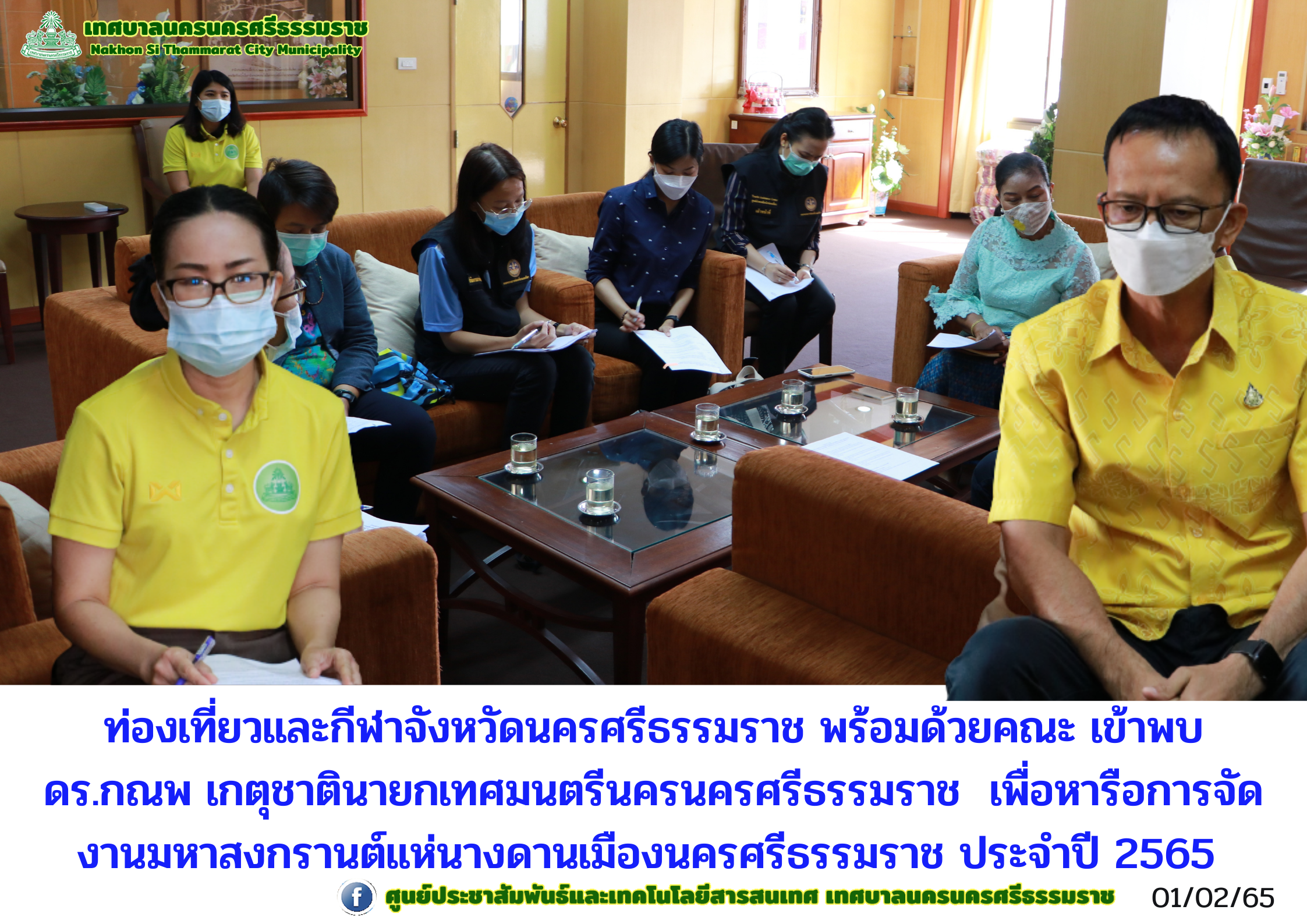 | ท่องเที่ยวและกีฬาจังหวัดนครศรีธรรมราช พร้อมด้วยคณะ เข้าพบ ดร.กณพ เกตุชาติ นายกเทศมนตรีนครนครศรีธรรมราช เพื่อหารือการจัดงานมหาสงกรานต์แห่นางดานเมืองนครศรีธรรมราช ประจำปี 2565 |