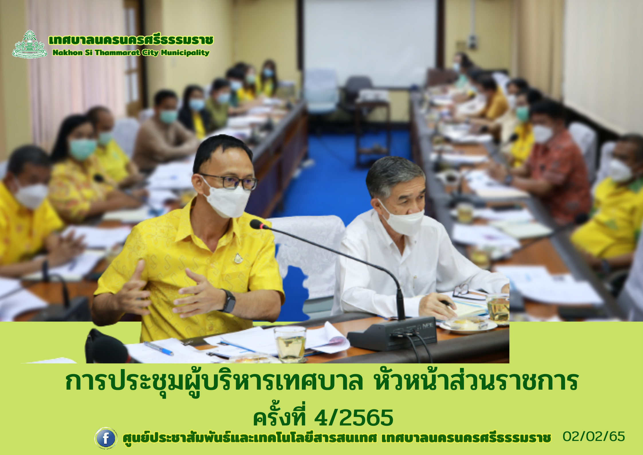 | วันพุธ ที่ 2 กุมภาพันธ์ พ.ศ. 2565 เวลา 10.00. น. ห้องประชุมชั้น 2 สำนักงานเทศบาลนคร ดร.กณพ เกตุชาติ นายกเทศมนตรีนครนครศรีธรรมราช เป็นประธานการประชุมผู้บริหารเทศบาล หัวหน้าส่วนราชการ ครั้งที่ 4/2565 เพื่อติดตามผลการปฎิบัติราชการ ดังนี้