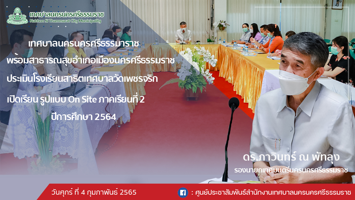วันศุกร์ที่ 4 กุมภาพันธ์ พ.ศ. 2565 ตั้งแต่เวลา 08.30 น. นายภาวินทร์ ณ พัทลุง รองนายกเทศมนตรีนครนครศรีธรรมราช  พร้อมด้วยคณะผู้บริหารสถานศึกษา  ลงพื้นที่ การประเมินสถานศึกษาเพื่อเปิดเรียน รูปแบบ On Site ภาคเรียนที่ 2 ปีการศึกษา 2564 ของสถานศึกษาในสังกัดเทศบาลนครนครศรีธรรมราช  ร่วมกับ นายวินัย วาหลวง สาธารณสุขอำเภอเมืองนครศรีธรรมราช และคณะ ลงพื้นที่ประเมิน โรงเรียนสาธิตเทศบาลวัดเพชรจริก