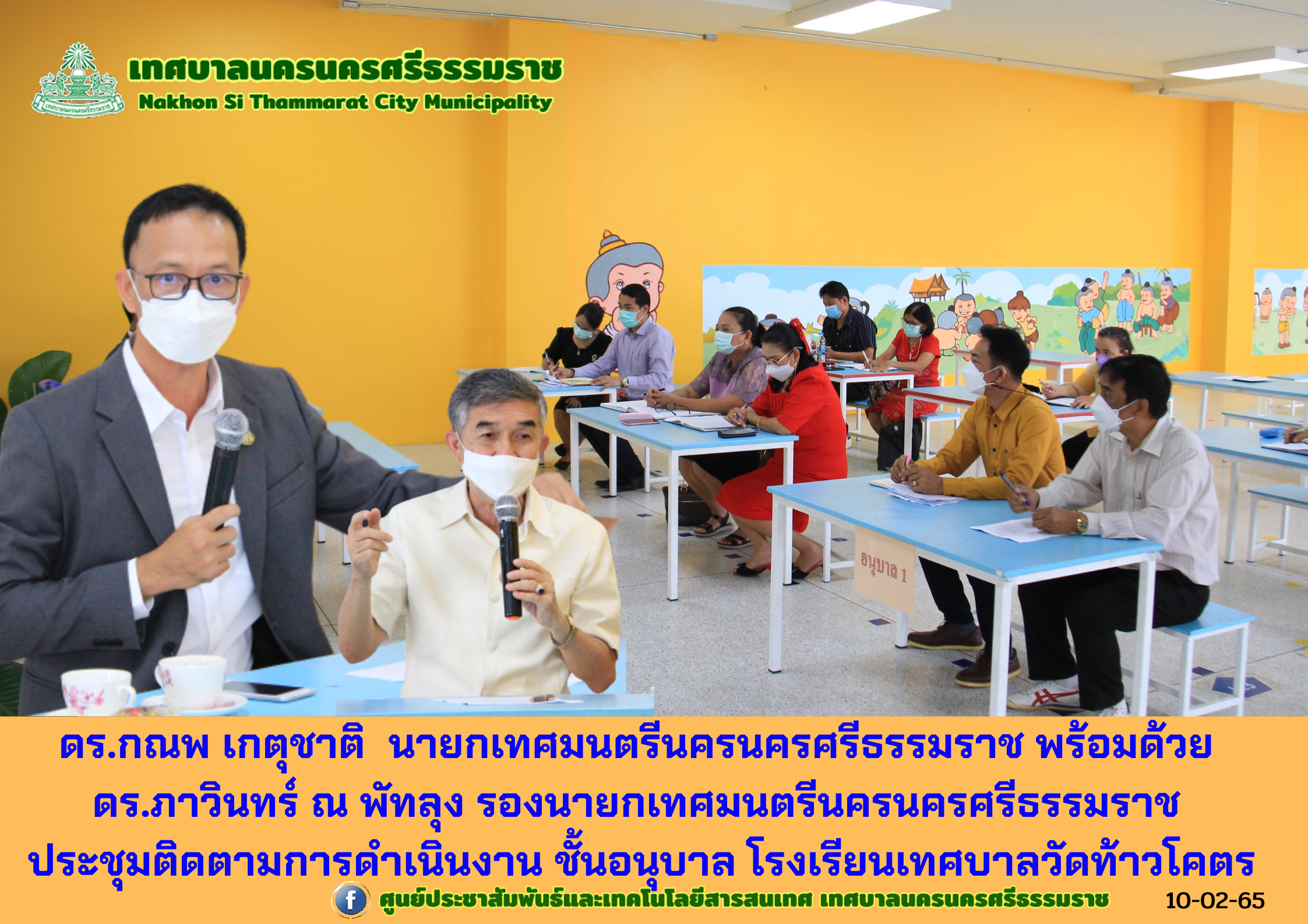 | ดร.กณพ เกตุชาติ นายกเทศมนตรีนครนครศรีธรรมราช พร้อมด้วย ดร.ภาวินทร์ ณ พัทลุง รองนายกเทศมนตรีนครนครศรีธรรมราช ประชุมติดตามการดำเนินงาน ชั้นอนุบาล โรงเรียนเทศบาลวัดท้าวโคตร |