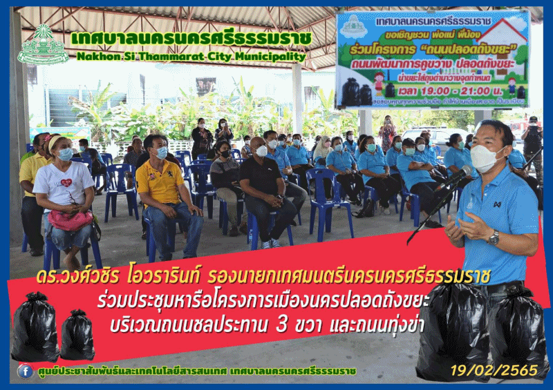 | ดร.วงศ์วชิร โอวรารินท์ รองนายกเทศมนตรีนครนครศรีธรรมราช นำสมาชิกสภาเทศบาล เขต4 และเจ้าหน้าที่กองสาธารณสุขและสิ่งแวดล้อม ประชุมเตรียมพร้อมโครงการเมืองนครปลอดถังขยะ |
