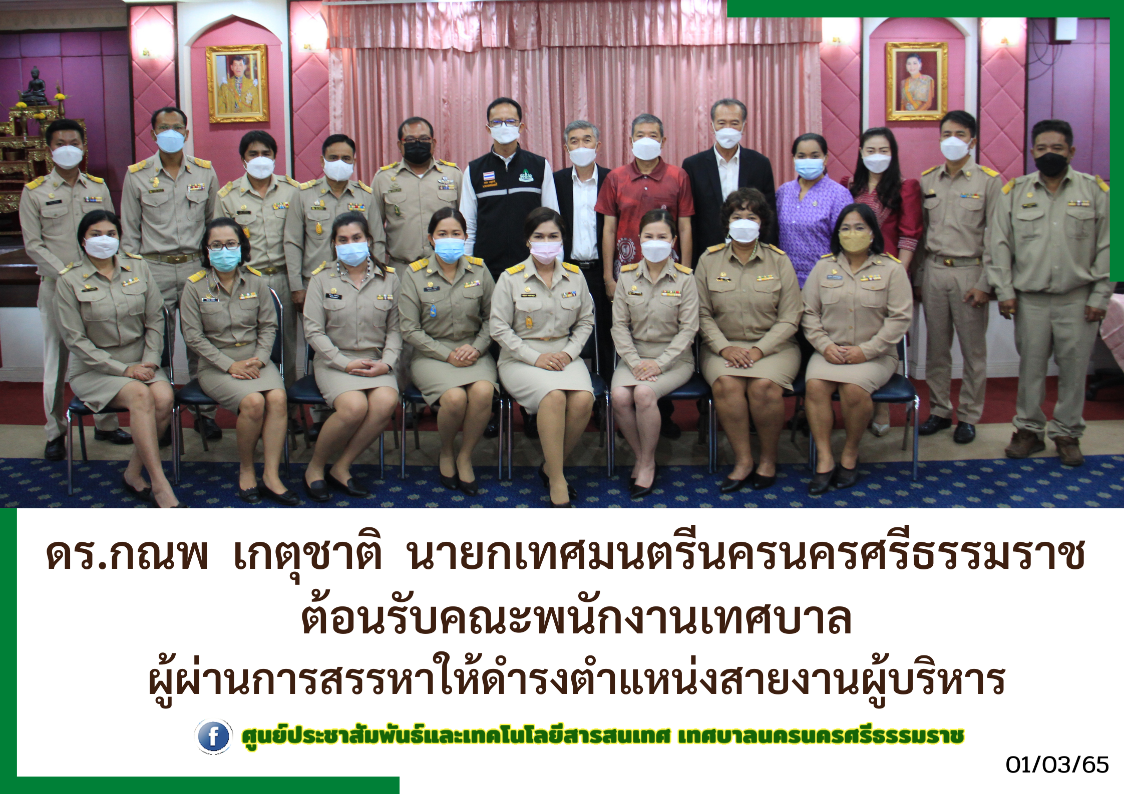 | ดร.กณพ เกตุชาติ นายกเทศมนตรีนครนครศรีธรรมราช พร้อมด้วย คณะผู้บริหารเทศบาล ต้อนรับคณะพนักงานเทศบาลผู้ผ่านการสรรหาให้ดำรงตำแหน่งสายงานผู้บริหาร สังกัดเทศบาลนครนครศรีธรรมราช |