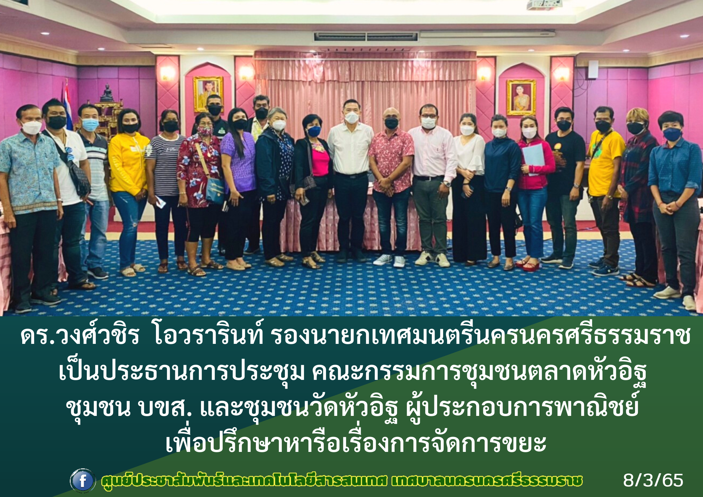 | วันอังคาร ที่ 8 มีนาคม 2565 เวลา 10.00 น. ณ ห้องประชุมชั้น 5 สำนักงานเทศบาลนครนครศรีธรรมราช ดร.วงศ์วชิร โอวรารินท์ รองนายกเทศมนตรีนครนครศรีธรรมราช เป็นประธานการประชุม คณะกรรมการชุมชนตลาดหัวอิฐ ชุมชน บขส. และชุมชนวัดหัวอิฐ ผู้ประกอบการพาณิชย์ เช่น ห้องเย็น โรงแรม สถานที่สะสมอาหาร และเจ้าของตลาดรอบชุมชน เพื่อปรึกษาหารือเรื่องการจัดการขยะและการรักษาความสะอาด รวมถึงโครงการปลอดถังขยะในชุมชน |